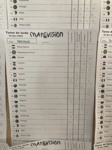 Unha vez asignado o país correspondente a cada grupo, o seguinte foi escoller unha canción, preparar unha actuación de entre 2 e 3 minutos e gravala en vídeo. Antes disto, o alumnado foi informado das catro categorías susceptibles de votación. Todos os vídeos foron proxectados no salón de actos da Facultade o día de Matevisión. Ao finalizar, cada grupo realizou as votacións oportunas (ver figura 2). Para facilitar esta tarefa, entregouse a cada grupo unha folla cos nomes dos países participantes (ver figura 3). Os resultados destas votacións foron amosados por pantalla, dando a coñecer así tanto os gañadores de cada categoría como o país gañador do festival (ver figura 4).